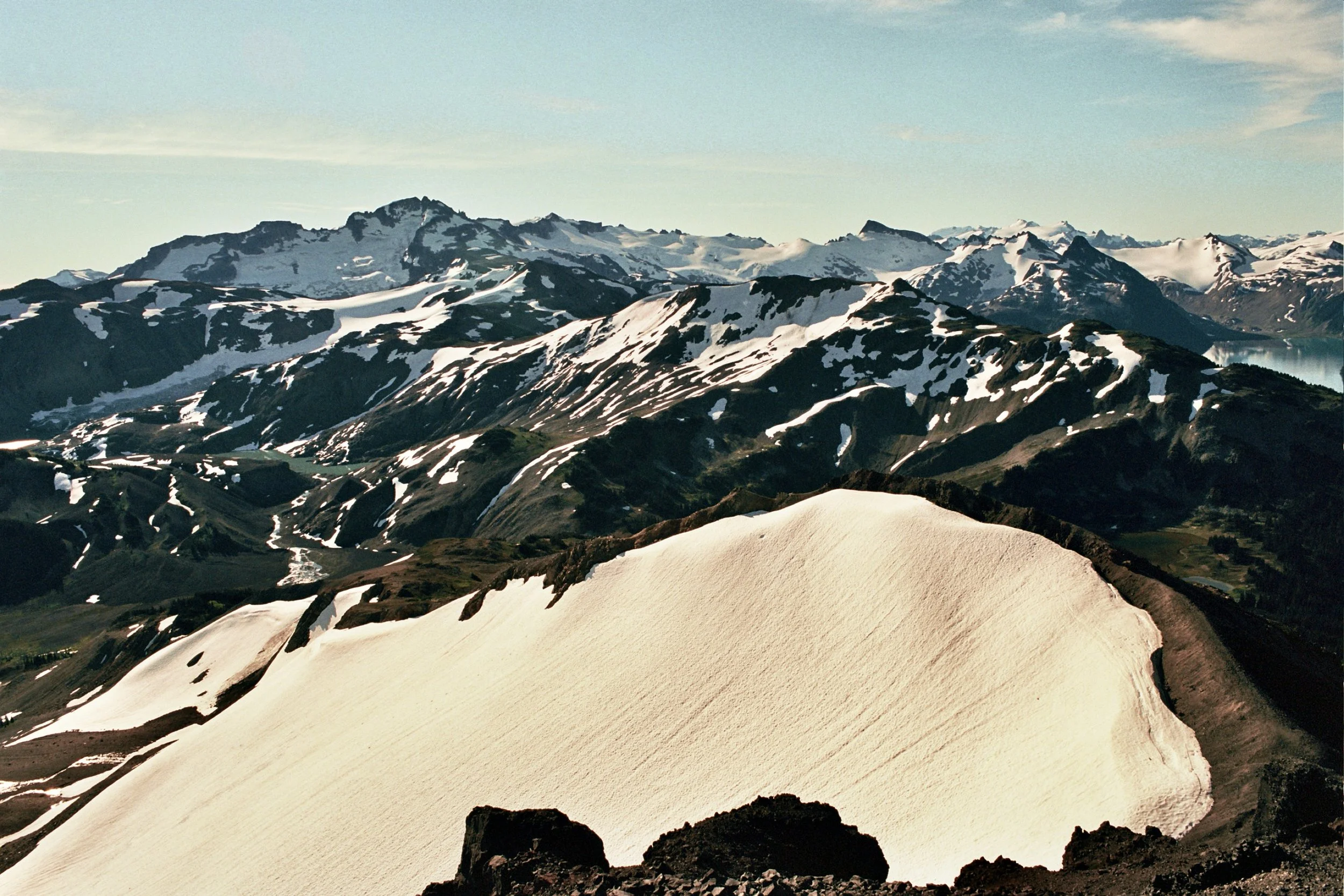 From Taylor Meadows Campground, we climbed Black Tusk, then continued up to Garibaldi Panorama Ridge. After taking in the views, we returned to Taylor Meadows, packed up our backpacks, and hiked on to Helm Creek Campground. It was an exhausting but incredibly beautiful day. We set off at 6 a.m. and didn’t reach camp until 6 p.m.